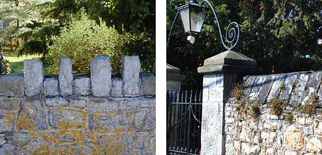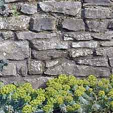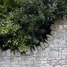 Boundary wall - irregular stone walls form edges to gardens and building boundaries, usually topped by a distinctive 'cock and hen' random stone capping, or occasionally stone copings with wrought iron railings above. The grander the building, the more elaborate the boundary treatment. The walls around St Mary's Church are topped with unusual black slag block copings, a by-product of the 18th century brass industry around Bristol